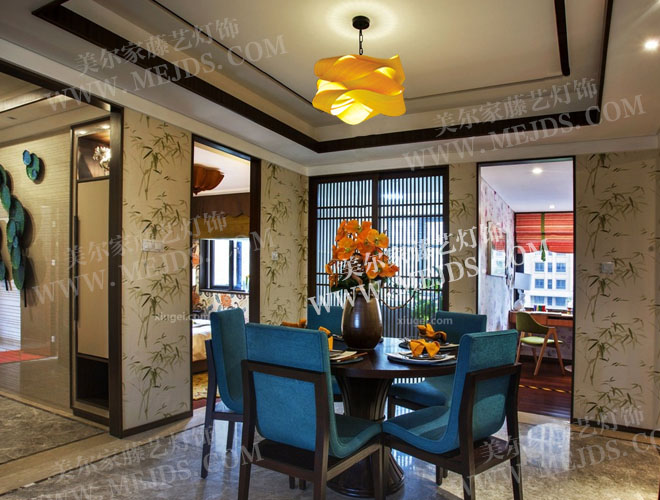 這款燈很輕巧,藤編的燈罩有一種別致的韻味,開燈后顯得玲瓏剔透的,大家都很喜歡!餐廳是一家人溫馨聚餐的場所,把它布置